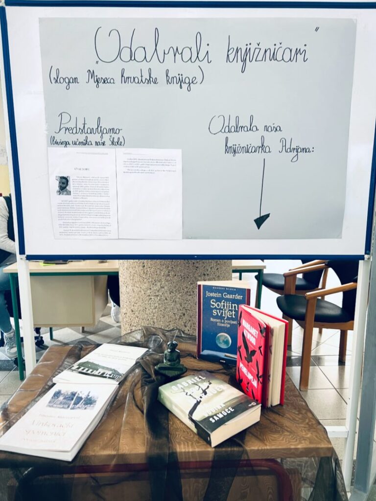 Svake godine se u listopadu i studenome obilježava Mjesec hrvatske knjige. Ove godine program se odvija pod geslom „Odabrali knjižničari“. Učenici 2.d. i 4.d uz pomoć profesorica Marije Burić i Vlaste Markasović pripremili su prigodni plakat na kojemu su predstavili knjižničara Gradske knjižnice Vinkovci Tihomira Marojevića, koji je bivši učenik naše Škole.